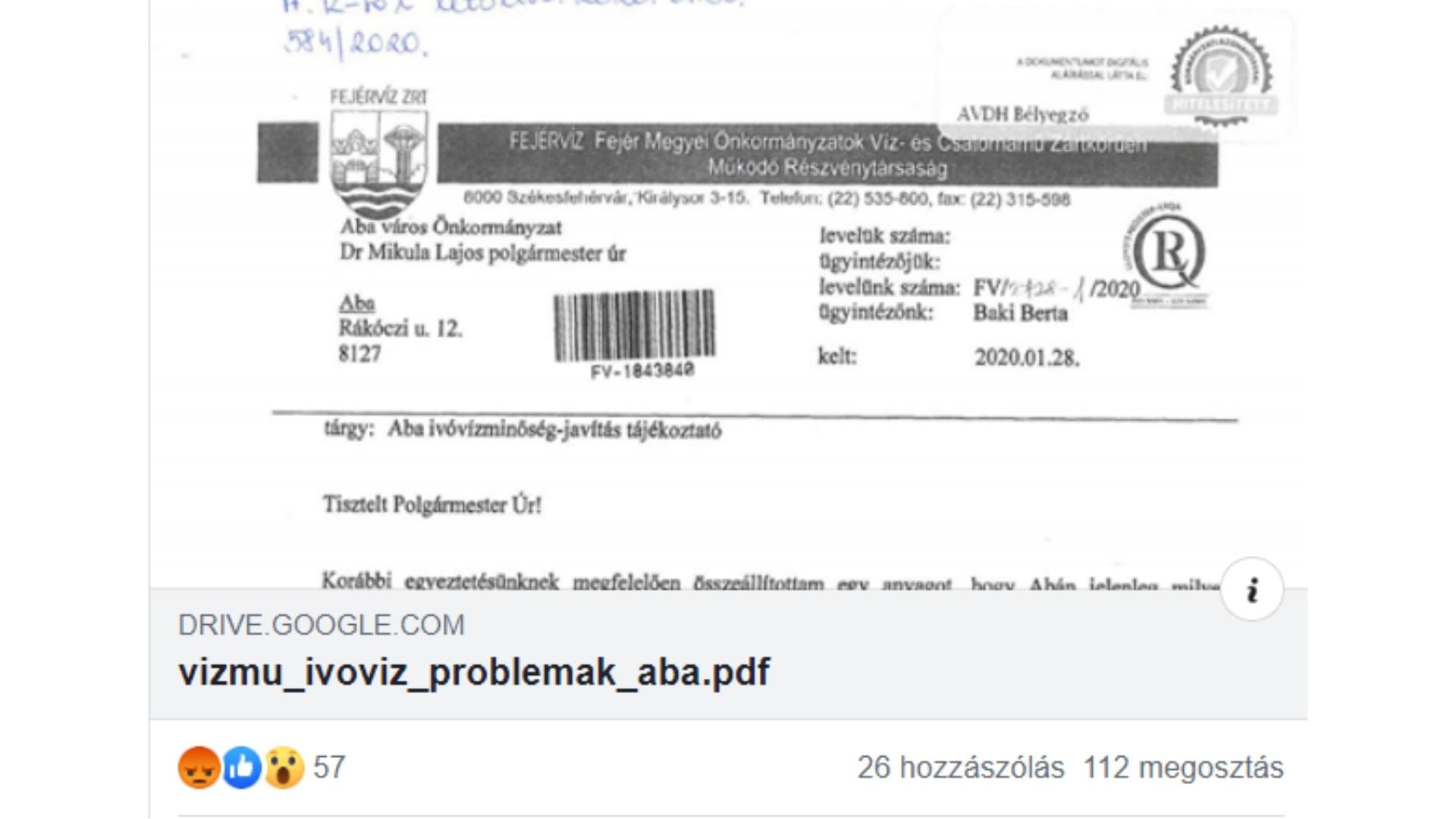 „Ütős bejegyzésében a polgármester arról tudósít, az önkormányzat megkapta azt a tájékoztató levelet a Fejérvíztől, amelyet az abai ivóvízellátás problémáinak összegzésére kért. Eszerint noha a Fejérvíz folyamatosan ellenőrzi a vízminőséget és mindent megtesz a nitrifikáció megakadályozására, az „abai szolgáltatott ivóvíz fogyasztása nagyon magas kockázatú”. A településen jelenleg üzemelő víztisztítóművel ugyanis nem biztosítható folyamatosan az ivóvízben az ammónium és a nitrit határérték alatti mennyisége. Ám az abai kutak vízében (szerencsére) csak határérték körüli az arzéntartalom – mert „a szűrők nem arzénmentesítésre készültek, így annak csak egy részét tudják visszatartani”. A Fejérvíz szakemberei a legnagyobb veszélyt jelentő nitrifikáció megelőzésére a kisebb fogyasztású időszakban csak a kisebb ammóniatartalmú kutakat üzemeltetik, és a tisztított vízhez klórdioxidot adagolnak. De meddig mehet ez így?” számolt be a Feol.hu!